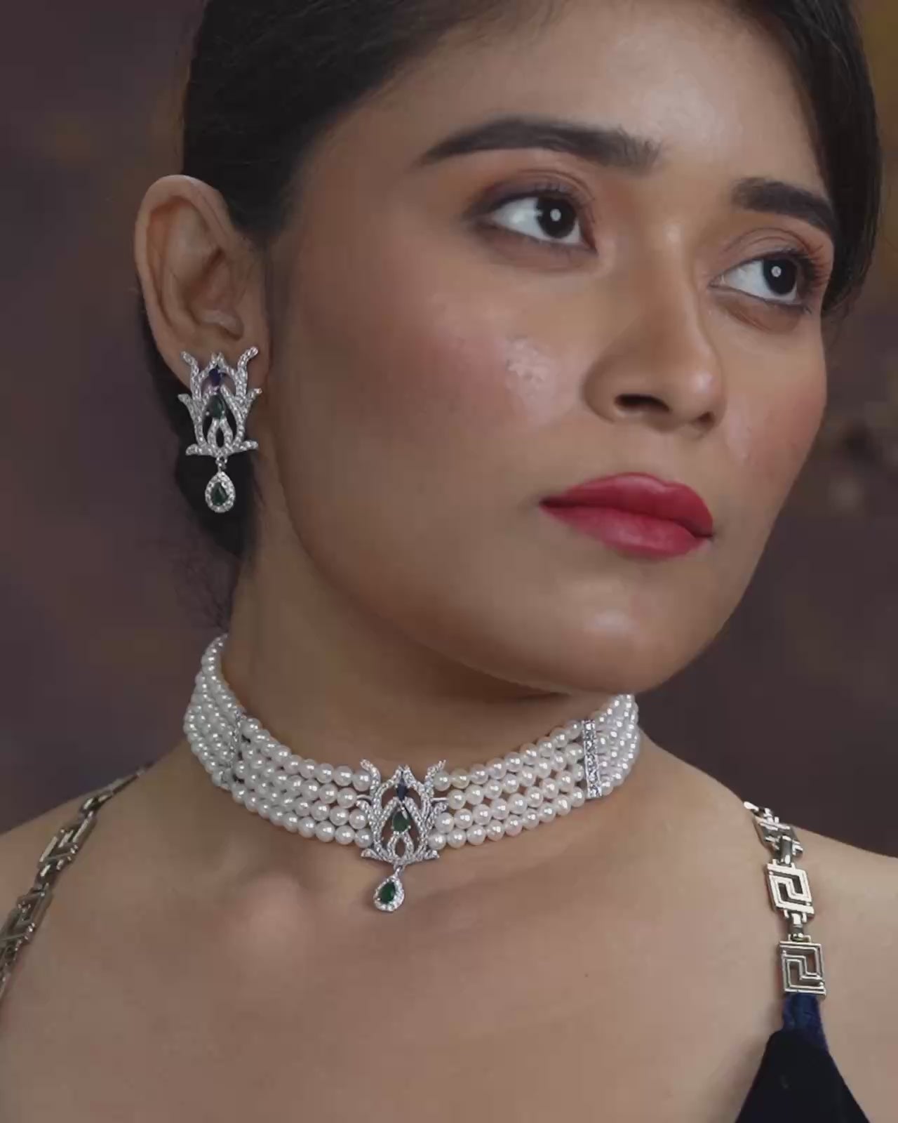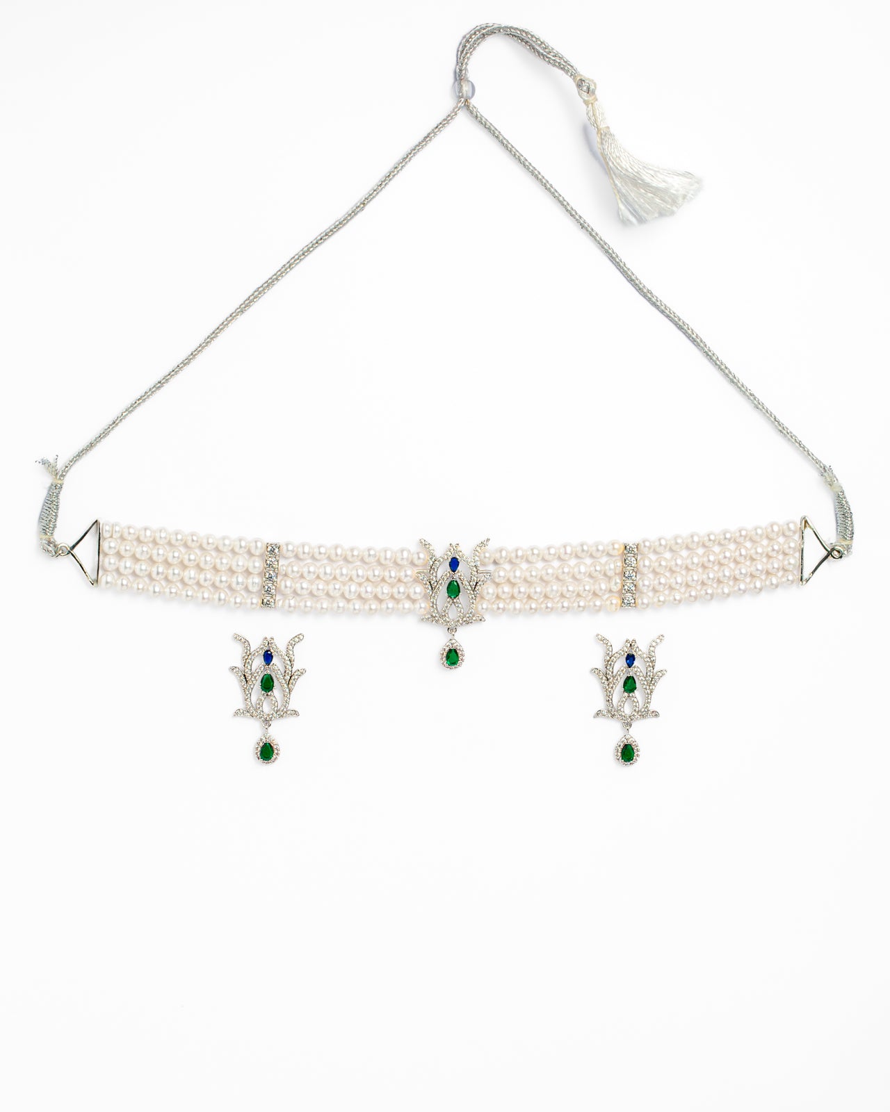 A refined multi-strand pearl necklace paired with matching earrings, highlighted by sparkling green CZ stones. Perfect for weddings, festive occasions, and graceful ethnic wear.