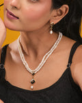 This gold tone set features luminous pearls paired with twinkling CZ stones bringing a warm rich elegance to sarees lehengas and evening gowns