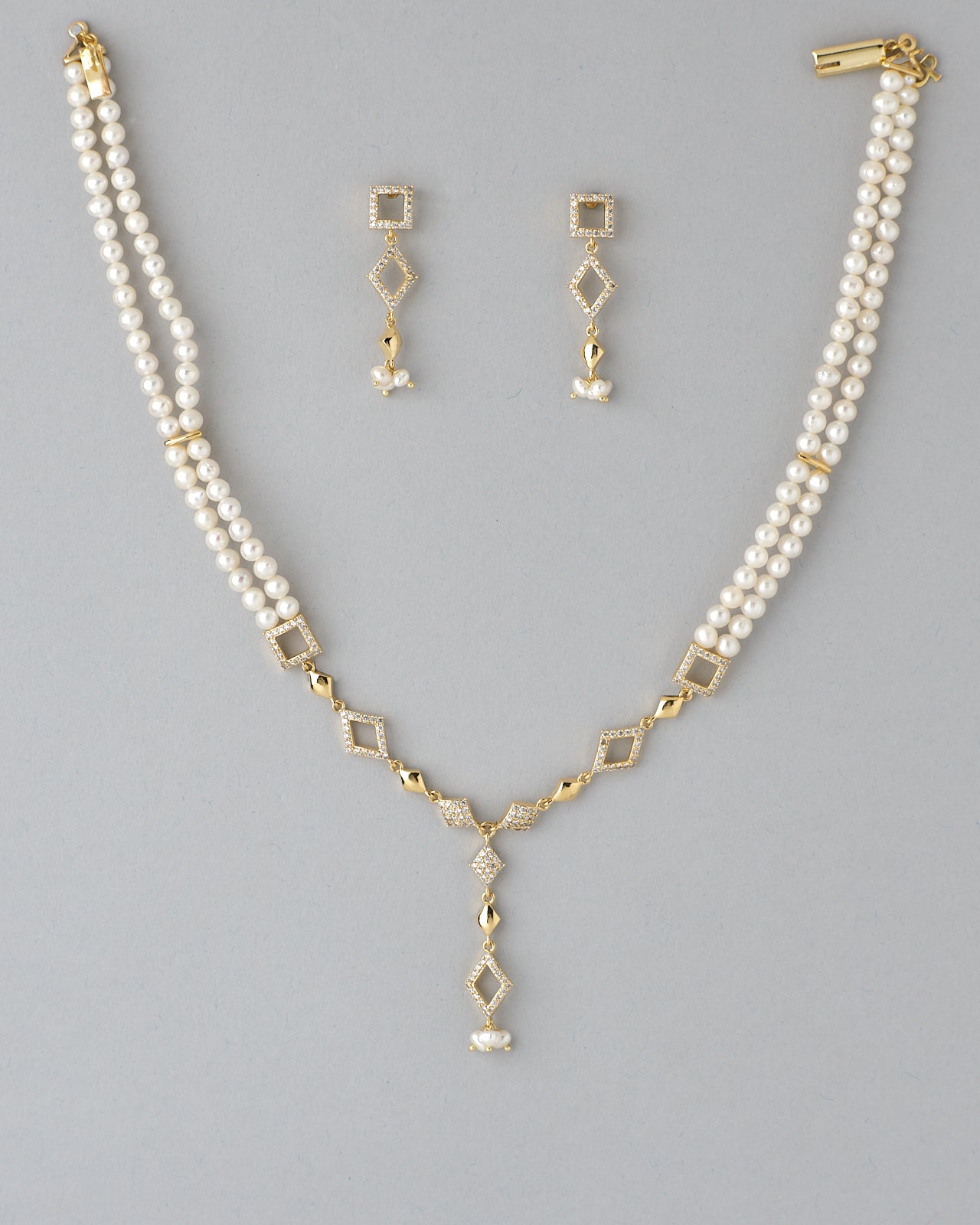 This necklace combines clusters of pearls with ornate gold frames holding ruby-like stones. The intricate pattern creates a bold yet elegant design, with earrings to match. A luxurious pick for festive occasions.