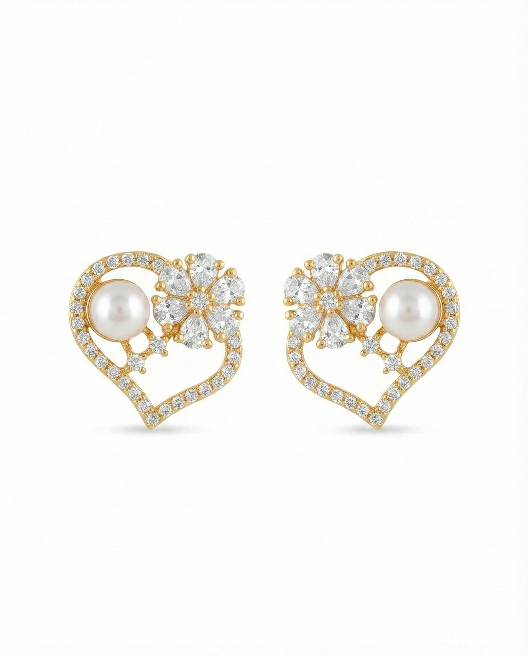 Celebrate love and beauty with these intricately designed heart-shaped stud earrings. A perfect marriage of classic elegance and romantic whimsy, these earrings feature a delicate gold-toned heart frame encrusted with shimmering CZ crystals.