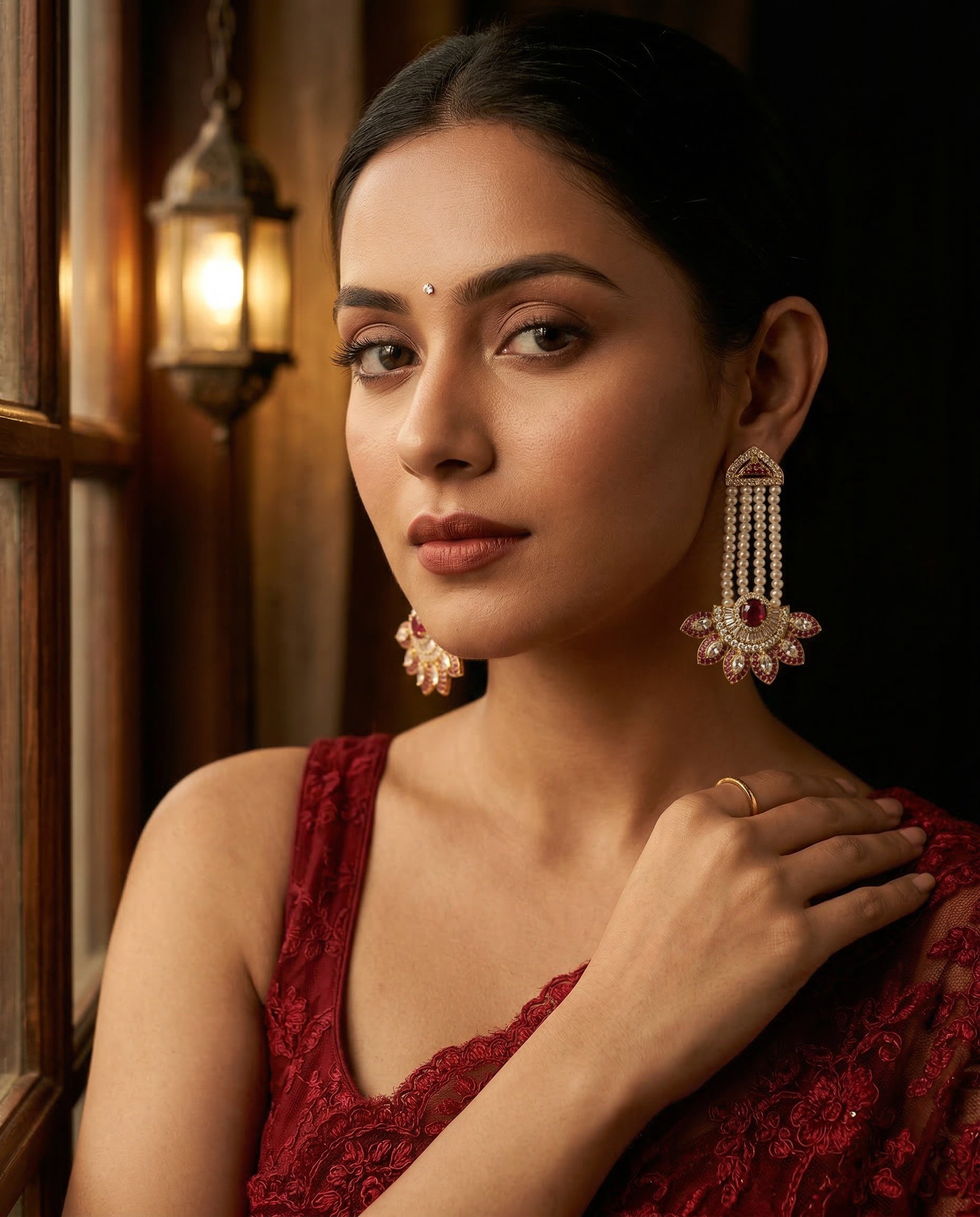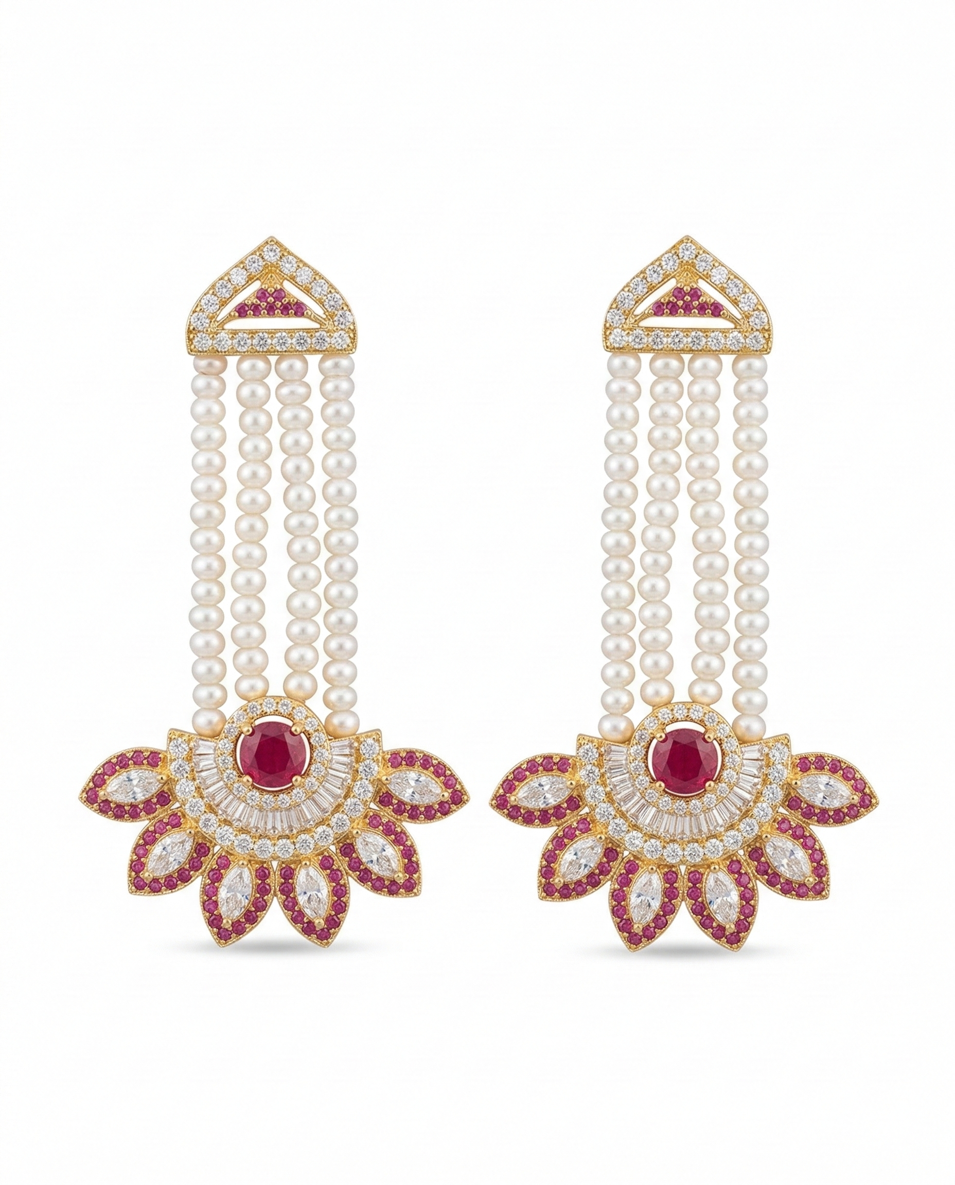 Make a grand entrance with these magnificent long tassel earrings, a perfect blend of architectural design and traditional opulence. The top features a triangular stud encrusted with shimmering white stones and a hint of ruby, leading into four elegant strands of pristine white pearls.