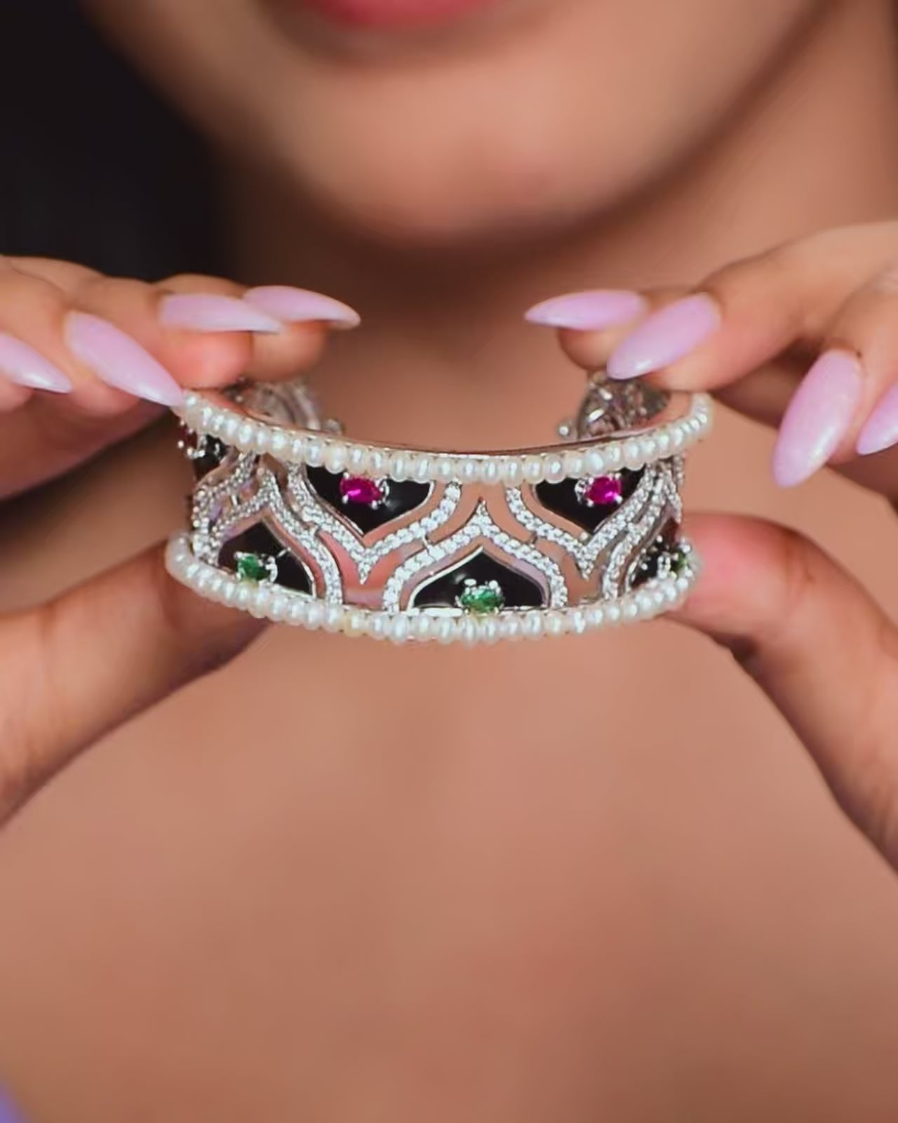 This designer bangle features a sophisticated interplay of emerald and ruby-toned CZ stones embedded within wave-inspired motifs. The outer border is lined with radiant pearls, adding depth and richness to its silver finish. A masterpiece of craftsmanship, this bangle is ideal for festive occasions, weddings, and anyone who loves jewellery that blends tradition, colour, and contemporary detailing.