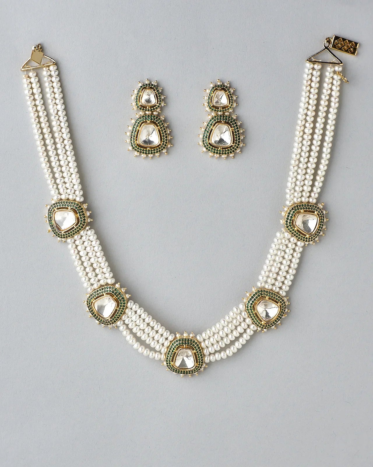 An opulent pearl necklace designed with rows of pearls and embedded kundan motifs bordered with green detailing. Paired with matching earrings, it’s a regal choice for weddings and grand festivities.