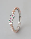A sophisticated bangle featuring pink pearls with a diamond-shaped centerpiece embellished with green and pink gemstones. A perfect blend of tradition and elegance for festive and wedding occasions