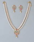Crafted with luminous pearls and ruby-colored accents, this layered necklace is a statement of timeless grace. Perfect for bridal trousseau, it pairs sophistication with a hint of regal charm