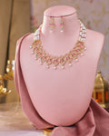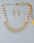 A stunning bridal necklace featuring interlinked CZ-studded circles adorned with ruby accents and lustrous pearls. The triple-layer pearl strands add richness, making it a perfect match for wedding and reception looks.