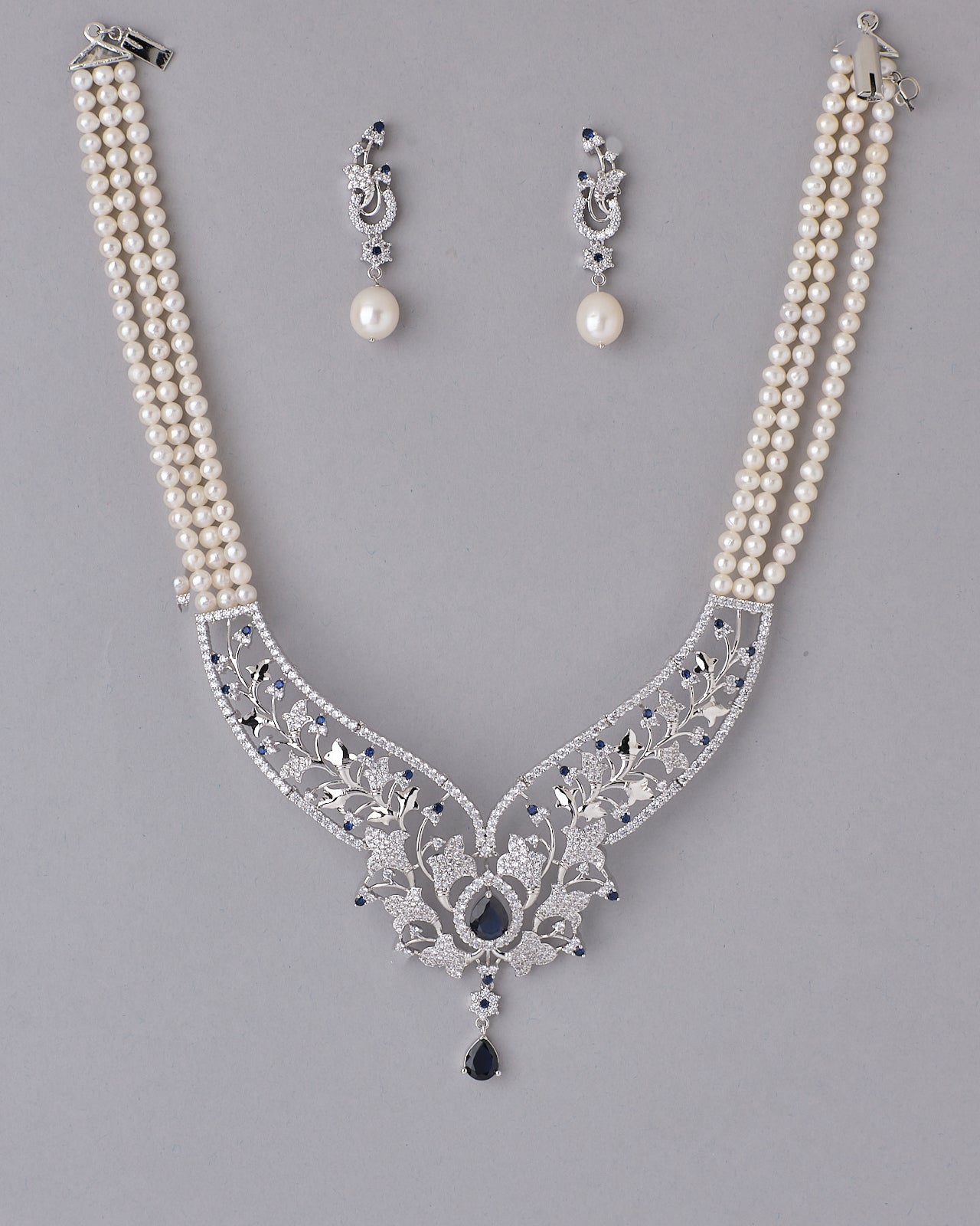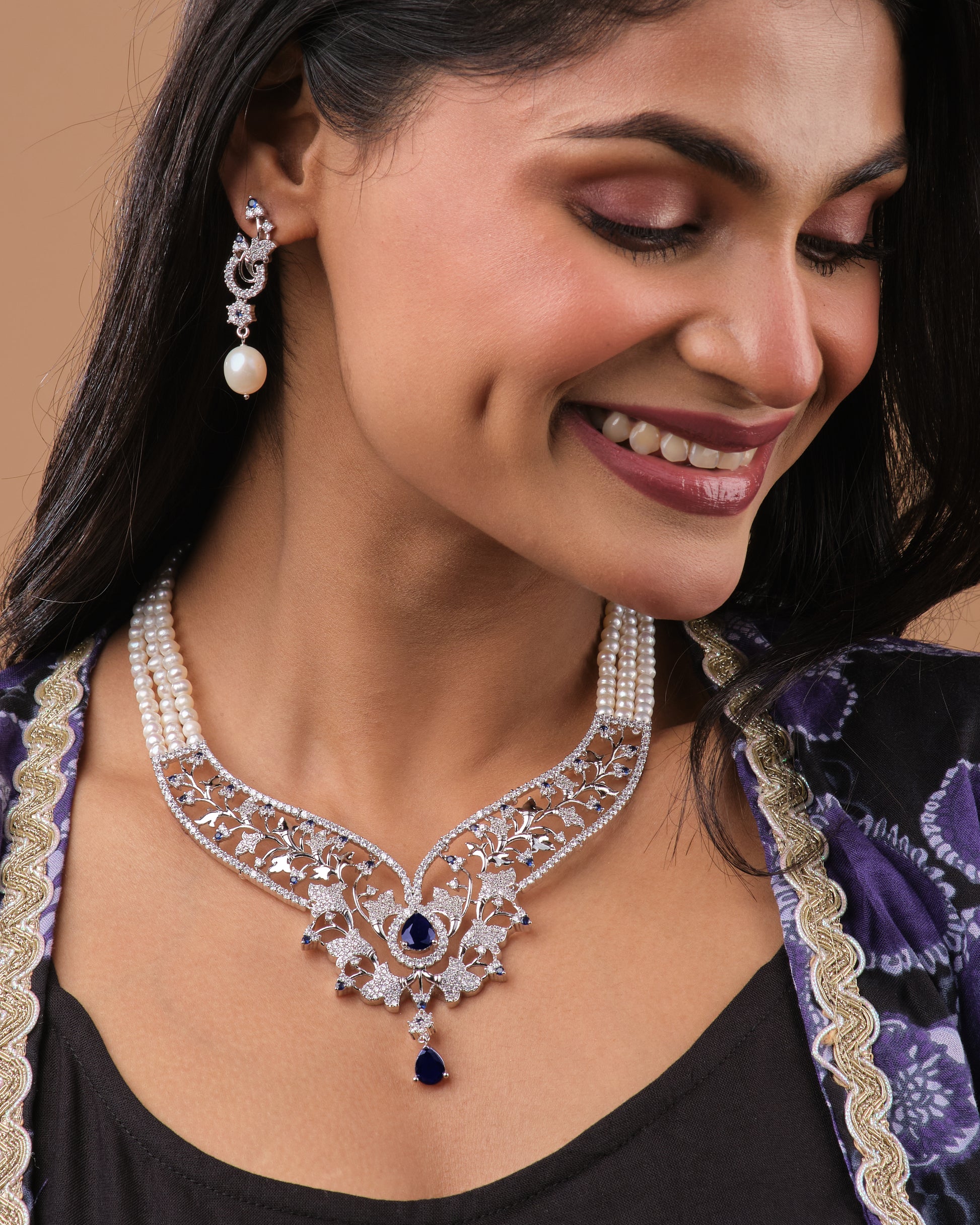 Sapphire Blue CZ Vine Pearl Statement Necklace Set