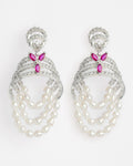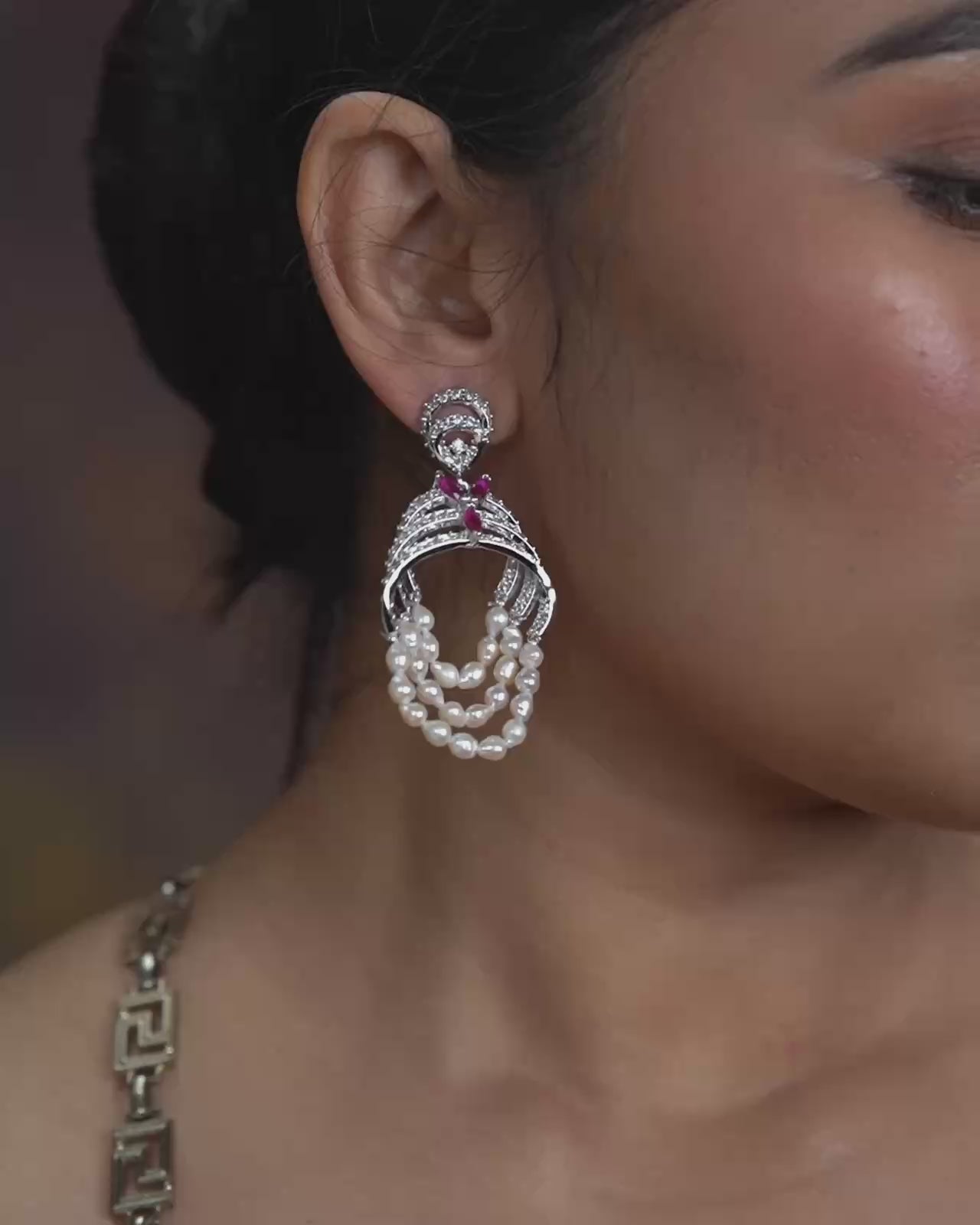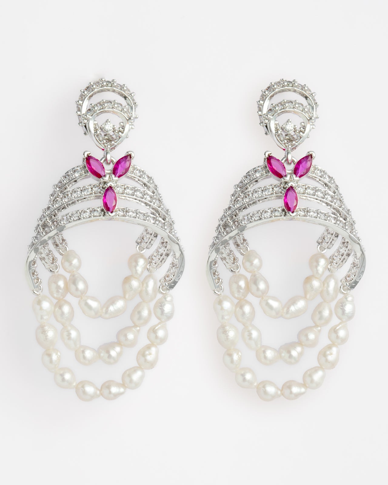 Elegant chandbali-style earrings featuring sparkling CZ stones with ruby-toned accents and cascading pearl drops. Perfect for weddings, festive occasions, and statement ethnic looks.