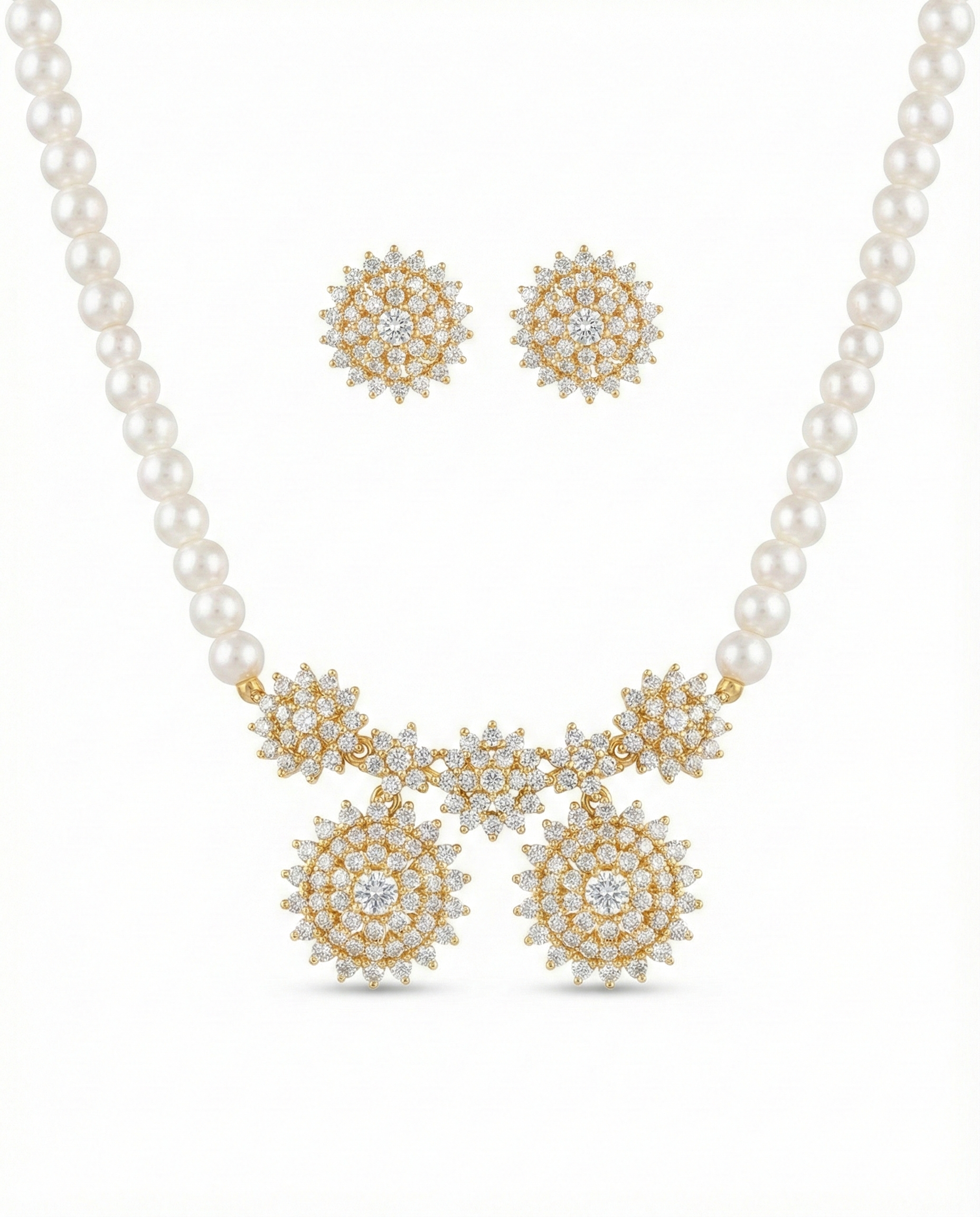 Illuminate your next special occasion with this breath-taking Pearl and Floral CZ Jewellery Set. Combining the soft glow of premium white pearls with the brilliant fire of precision-set stones, this set is designed for the woman who appreciates classic sophistication with a modern, regal touch.