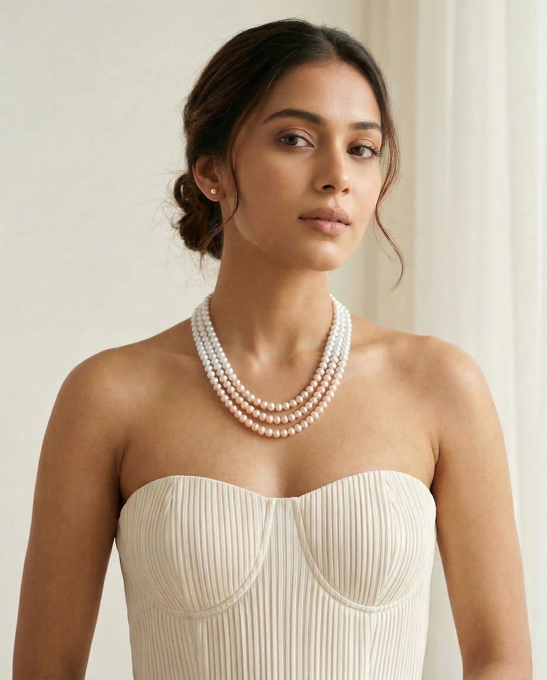 Infuse your look with ethereal charm and artisan detail. This Triple-Strand Pearl Mala features a beautiful gradient of hand-selected freshwater pearls, transitioning softly from creamy ivory to delicate peach and warm rose tones. The layered silhouette creates a rich, textural drape that sits perfectly against the décolletage.