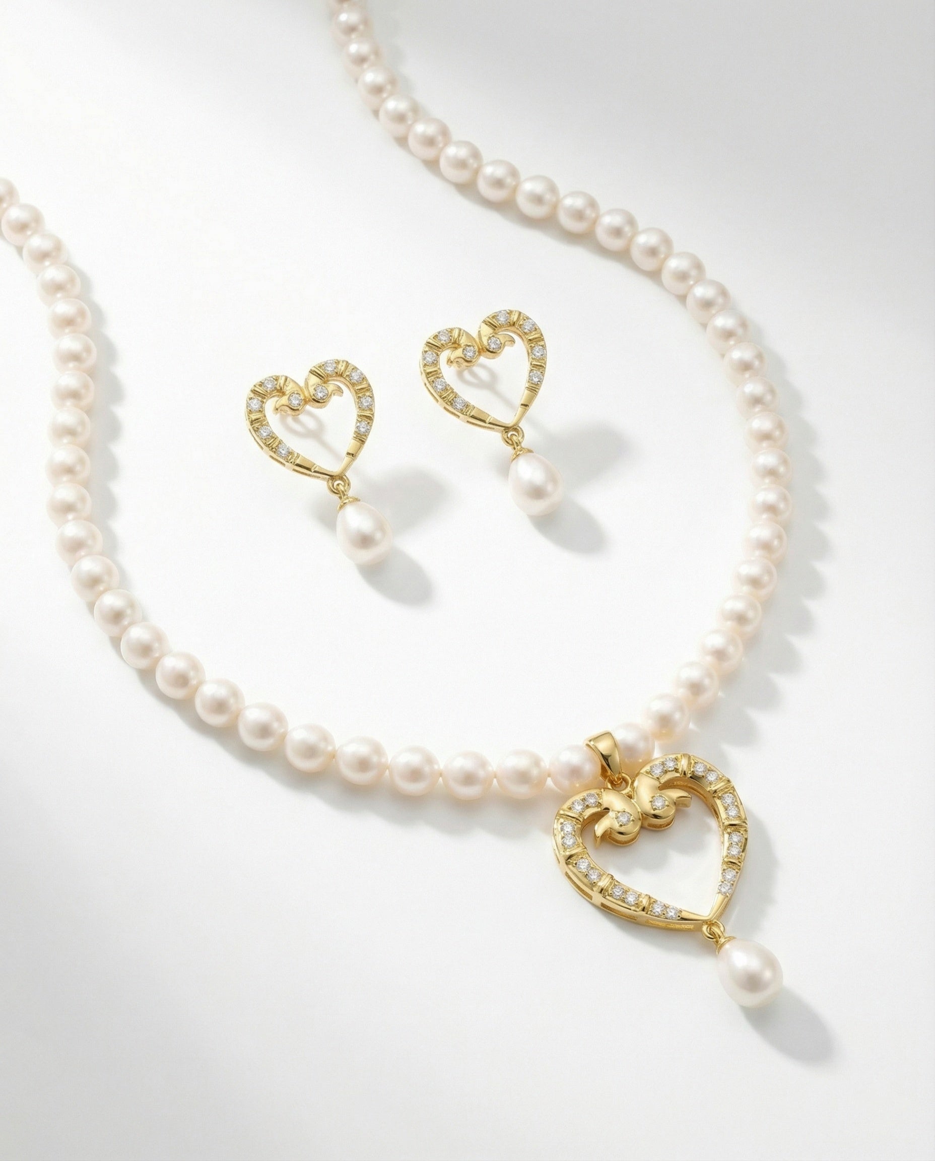 Elevate your jewellery collection with our Heart & Pearl Filigree Set, a stunning ensemble designed to capture hearts. This set features a high-lustre pearl strand necklace centred by an exquisite open-heart pendant. Crafted in radiant yellow gold, the pendant showcases intricate filigree scrollwork and is meticulously embellished with shimmering pavé-set crystals.