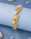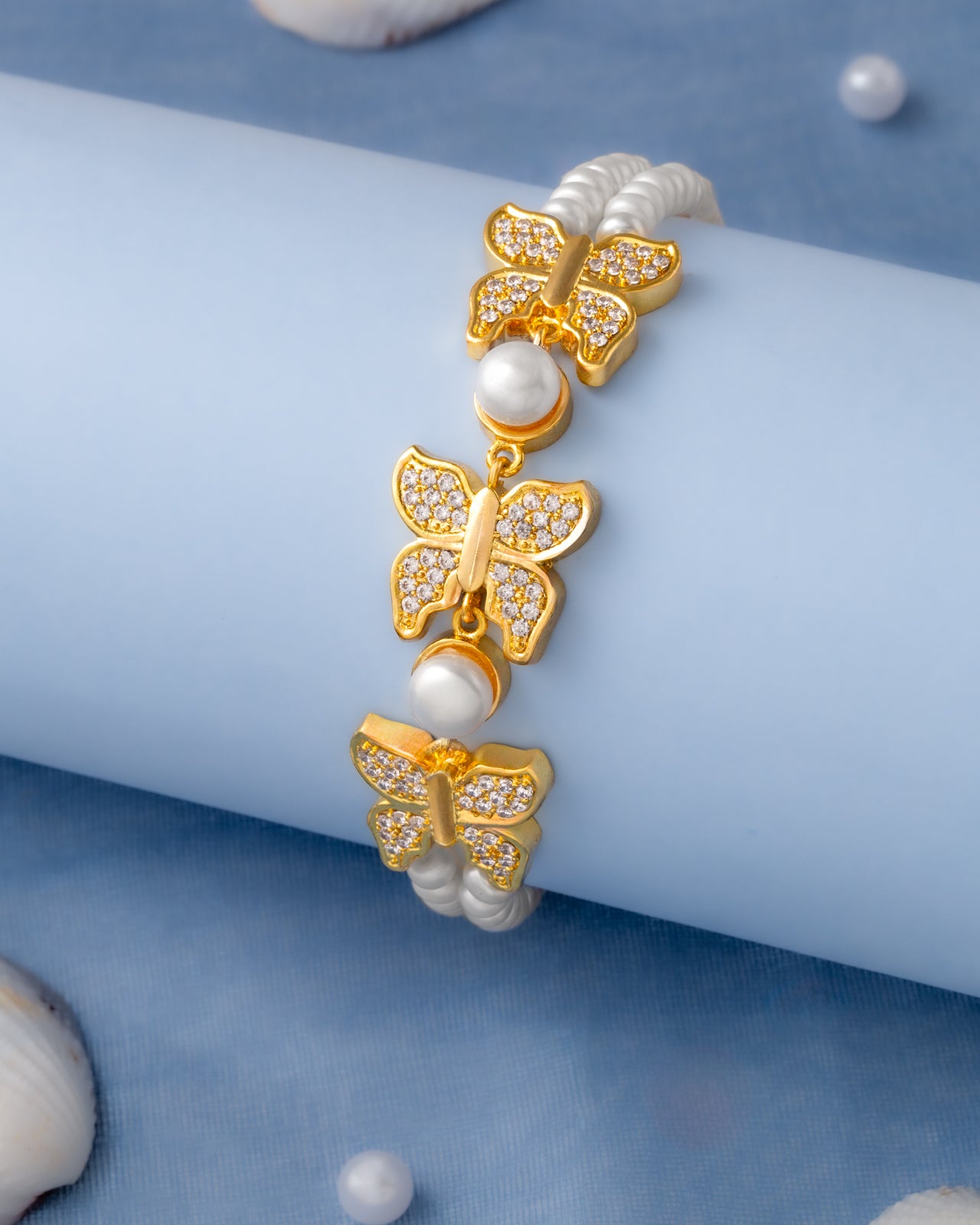 White Pearl Bracelet with Gold Finish Butterfly Motifs