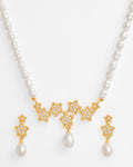 A graceful necklace set crafted with classic white pearls, highlighted by gold-tone floral motifs embellished with sparkling CZ stones. Paired with matching earrings, this set adds delicate charm and elegance to festive and traditional wear.